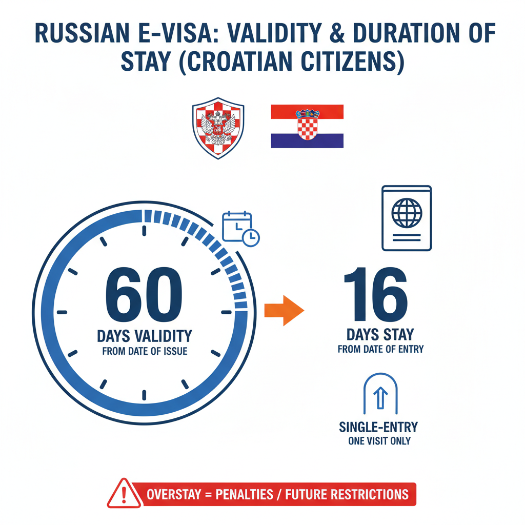 - The Russian e-Visa for Croatian citizens remains valid for 60 days from the date of issue.