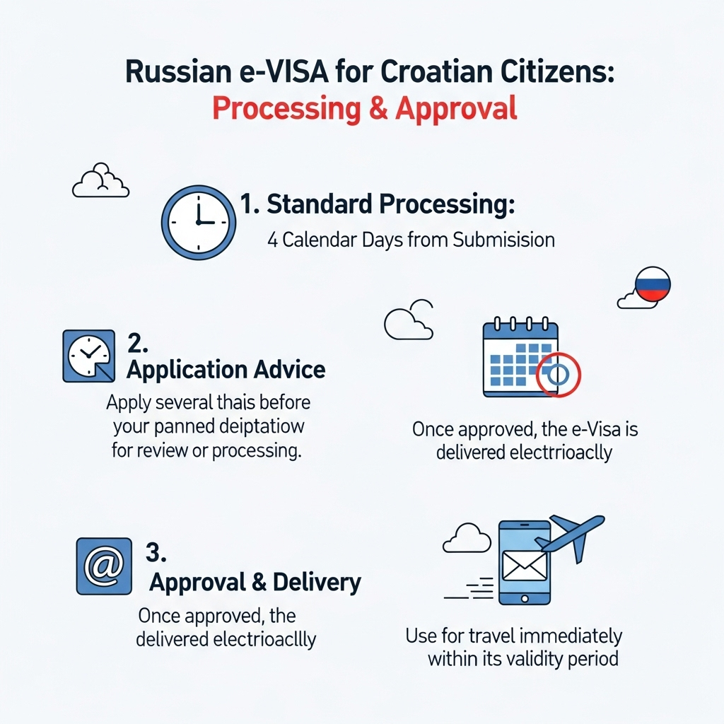- The processing time for a Russian e-Visa is generally 4 calendar days from the date of submission.